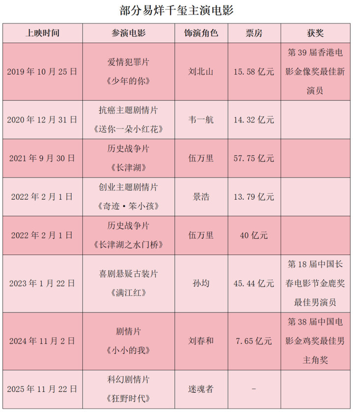 纵观易烊千玺这些年在电影界的征程,他几乎以每年一至两部新作的频率,持续在最重要的档期与最具实力的导演和演员合作,尝试不一样的影片类型和角色。这种稳步探索的节奏,使他成为中国电影界少数能够持续参与顶级制作的年轻演员。