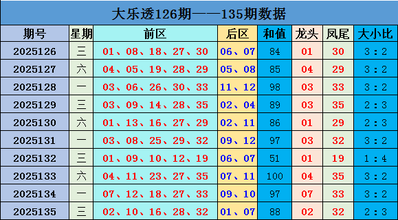 大乐透第2025135期,当期开奖号码为:前区02 10 16 28 32,后区01 07。龙头01,凤尾32,和值88。