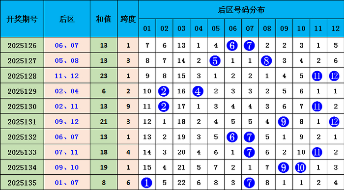 上期后区奖号01 07,为小大、奇奇组合,最近5期后区号码奇偶比为7:3,大小比为8:2。本期后区推荐小大、偶偶组合,推荐04 12。
