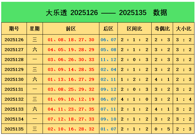 上期回顾:大乐透第2025135期奖号为:前区02、10、16、28、32,后区01、07,前区奖号三区比为2:1:2,奇偶比为0:5,大小比为2:3,后区开出小大组合01、07