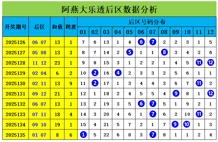 后区上期开出号码01、07,奇偶比为2:0,近十期后区奇偶比为11:9,总体看奇数走势稍热,本期后区要注意奇偶比1:1,五码复式参考:01 04 05 06 10,重点两码推荐:01 06
