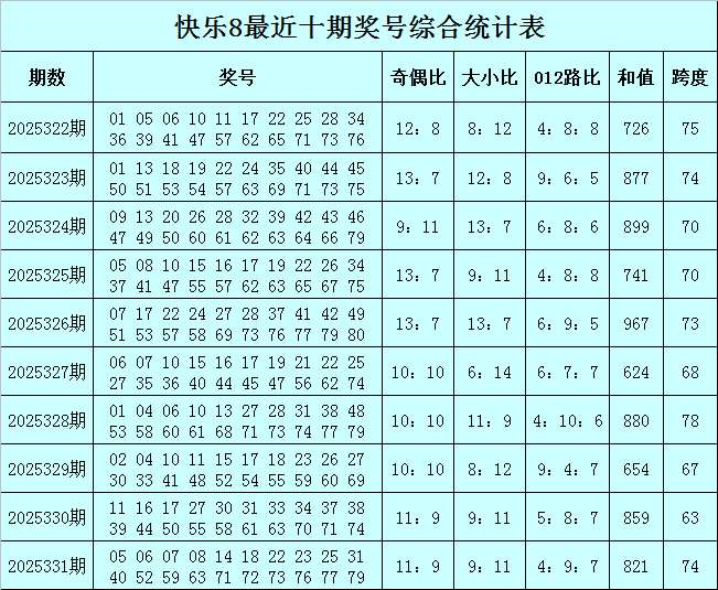 福彩快乐8第2025331期开出奖号:05 06 07 08 14 18 22 23 25 31 40 52 59 63 71 72 73 76 77 79,其中奖号奇偶比开出11:9,大小比开出9:11,和值开出821,跨度开出74,012路比开出4:9:7。